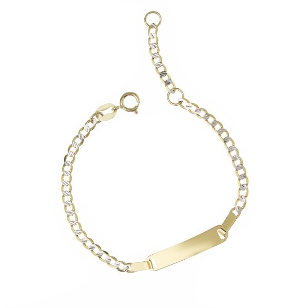 Тази изящна гривна е вечна класика в детската бижутерия, направена от скъпоценно 18-каратно злато с обработка, която съчетава жълто и бяло злато в елегантна верижна мрежа.