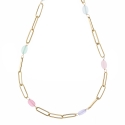 Това, което прави този бижу наистина специален, са нежните цветни кварцови камъни, разположени хармонично по веригата. Тези скъпоценни камъни в нежни пастелни нюанси - розово, синьо, водно зелено и лилаво - предизвикват сладостта на цъфтяща градина, добавяйки докосване на цвят и лекота към златото.