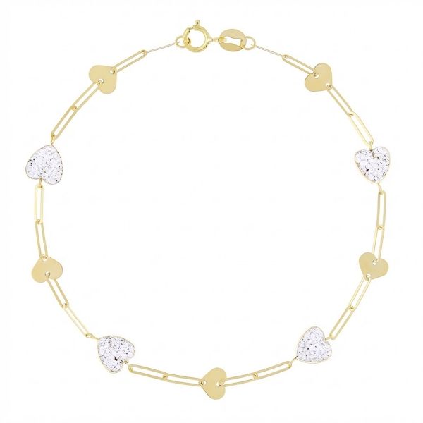 Střídání leštěných zlatých srdíček a srdíček zdobených bílým zirkonovým pavé vytváří magnetickou hru světla, která osvětluje každé vaše gesto. Použití vysoce kvalitní bílé pryskyřice jako základu pro zirkony zvýrazňuje lesk kamenů a dodává náramku svěží a luxusní vzhled.