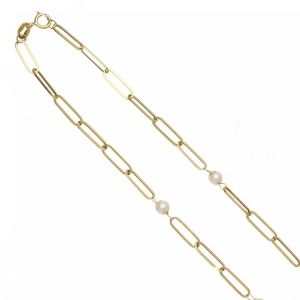Kæden består af elegante, langstrakte, ovale net, intervalleret med lysende perler, der tilføjer et øjeblik af tidløs klasse.