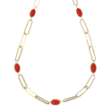 Et ikon for nutidens stil: Dette storslåede halskæde kombinerer det moderne design af de geometriske elementer i 18 karat gult guld med den tidløse skønhed i middelhavskoralet. Kæden, der er præget af elegante, langstrakte mesh, der minder om moderne kunst, er intervalleret med dyrebare, ovale røde koralperler, hvilket skaber en ekstraordinær farvekontrast.
