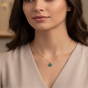 Det centrale element, et rundt vedhæng besat med funklende zirkonia, fremkalder smaragdens livlige dybde. Det er mere end bare en farve; det er et fyrtårn af energi og genfødsel, der tilføjer et strejf af kongelig farve til ethvert outfit.