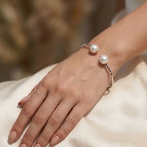 Das offene, minimalistische Design schmiegt sich elegant um das Handgelenk und gipfelt in der Begegnung zweier prächtiger Zuchtperlen.