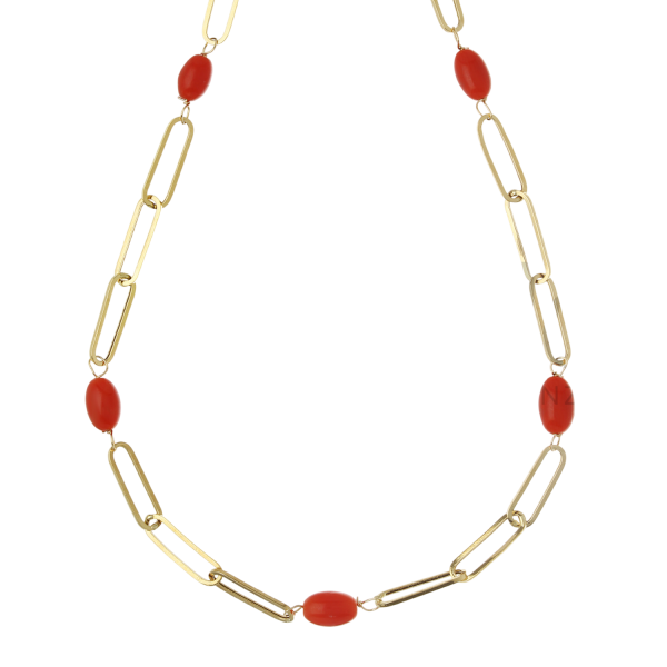 Die Veränderung zwischen den Elementen in poliertem Gelbgold und der roten Hitze der natürlichen Korallen schafft ein Spiel von Formen und Farben, die dieses Schmuckstück zu einem einzigartigen Stück seiner Art macht. Das kühne und minimalistische Design macht es perfekt für die zeitgenössische Frau, die sich mit Eleganz und Charakter auszeichnet.