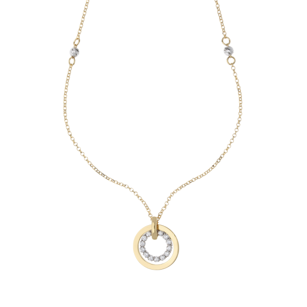 Lassen Sie sich von der zeitgenössischen Eleganz unseres exklusiven Catenine mit rundem Anhänger erobern, einem Juwel, das die harmonische Begegnung zwischen Gelbgold und 18K Weißgold feiert.