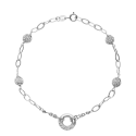 Η ευαίσθητη αλυσίδα από οβάλ πλέγματα εναλλάσσεται αρμονικά με τέσσερις λαμπερές σφαίρες που είναι πλήρως χτισμένες με λευκά ζιρκόνια, δημιουργώντας ένα παιχνίδι φωτός που αμέσως τραβάει την προσοχή. Ο σχεδιασμός είναι εμπλουτισμένος από ένα χαρακτηριστικό κεντρικό στοιχείο: ένα κύκλο που εν μέρει περιβάλλεται από ζιρκόνια που έχουν τοποθετηθεί σε πάβο, προσθέτοντας μια πινελιά σύγχρονης κομψότητας.