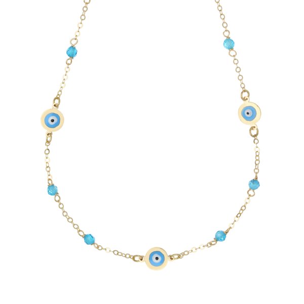 La delicada cadena de oro puro apoya con gracia cuatro preciosos amuletos redondos del Ojo de Allah, alternando con cuentas de cristal azul brillantes que capturan la luz a cada movimiento.