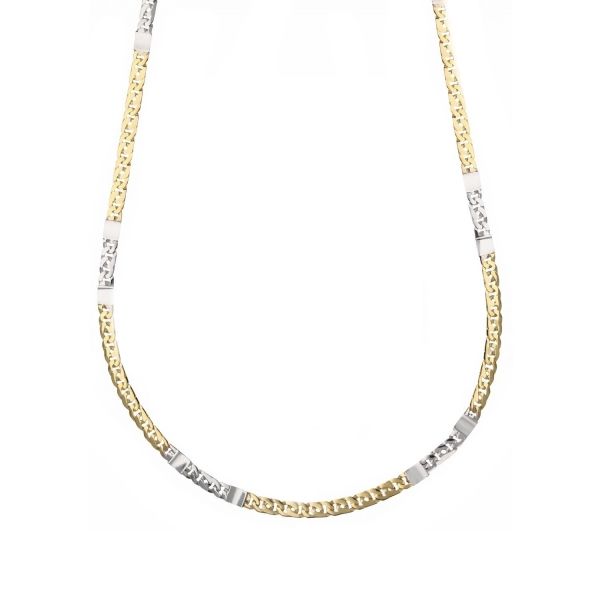 Le traitement particulier de la chaîne crée un effet tridimensionnel qui capture la lumière, tandis que l'alternance des deux bords donne un caractère unique et distinctif au bijou.
