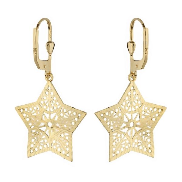 Ces élégantes boucles d'oreilles en forme d'étoile fascinent pour leur design délicat et raffiné. Les silhouettes étoiles en or 18k sont caractérisées par un traitement perforé et filigrane, qui crée un effet suggestif de légèreté et de transparence.