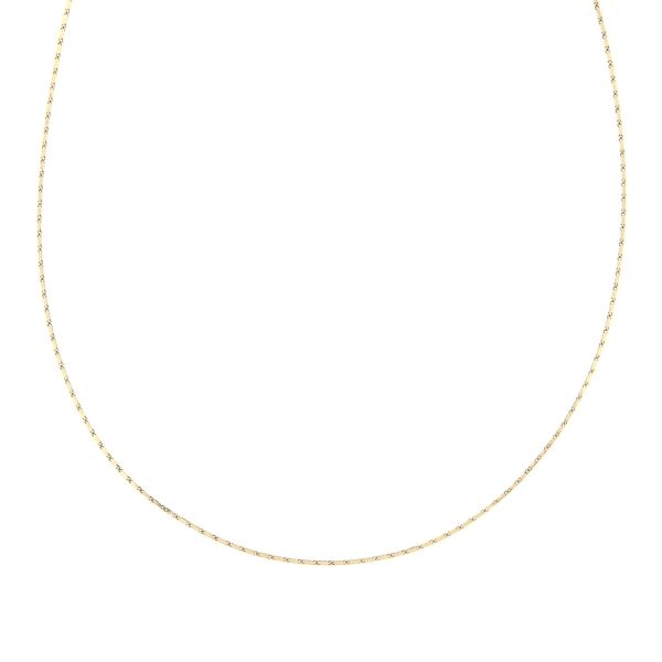 Prefinjena 18-karatska zlatna ogrlica sa prefinjenim oblikovanjem. Lanac je napravljen od šipke koja stvara elegantan efekat svjetlosti kada se nosi. Također je izuzetno čvrsta zahvaljujući svojoj mrežnoj strukturi.