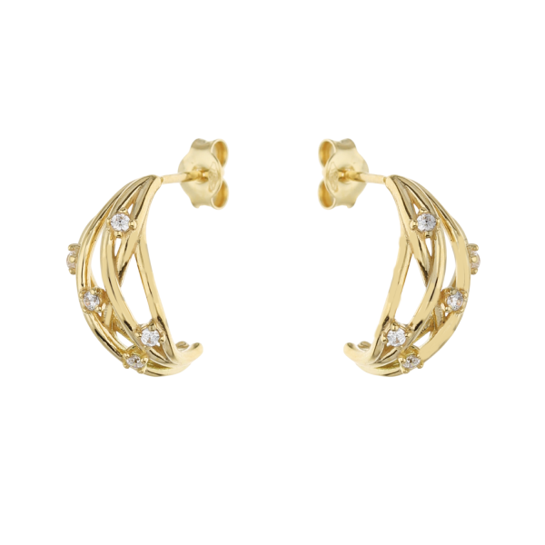 Minden fülbevalót dicsőíti a fehér cirkonokat stratégiailag fészkelő az arany szálak között, amelyek rögzítik és tükrözik a fényt minden mozgásra, fényes és diszkrét fényt adnak.