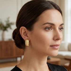 Lenyűgöző, lekerekített téglalap alakú fülbevaló pár, teljes egészében finom 18 karátos sárgaaranyból készült. A polírozott felület kiemeli a mesterségbeli munkát, háromdimenziós hatást keltve.