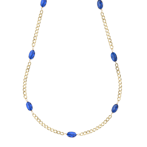 Ez a csodálatos kerek nyak megváltoztatja az arany elemeit, intenzív kék kövekkel ovális alakú. A köveket rendszeres időközönként rendezik az aranylánc mentén, ritmikus és elegáns hatást teremtve. A fényes kék meleg arany kombinációja lenyűgöző kontrasztot hoz létre, amely csodálatos módon rögzíti a fényt.