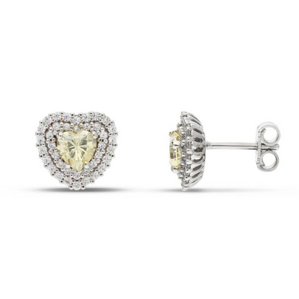 გაანათეთ თქვენი სახე ამ არაჩვეულებრივი საყურეების სითბოთი. კლასიკური გულის ფორმის დიზაინი განახლებულია ნათელი ყვითელი ცენტრალური ქვით, რომელიც სიხარულისა და პოზიტიური ენერგიის სიმბოლოა.