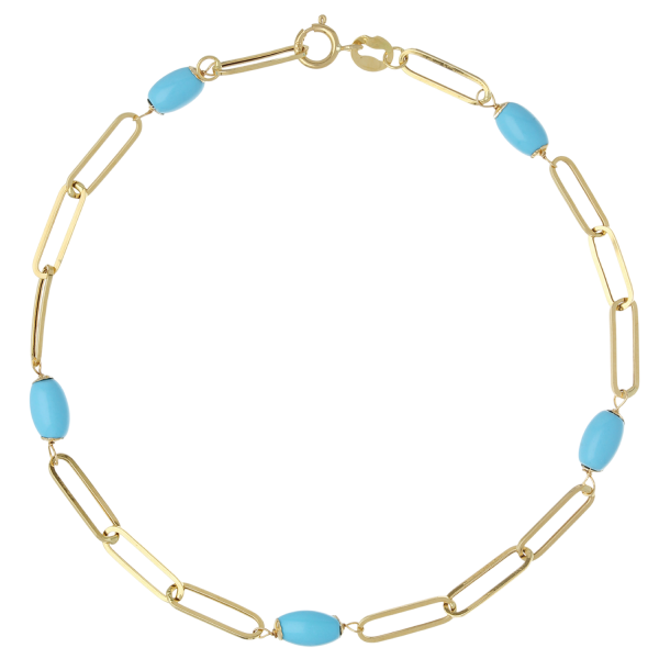Laat je meeslepen door deze prachtige armband die de waarde van 18k geel goud combineert met de levendige frisheid van turquoise.