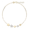 Centralna kompozycja to harmonijna sekwencja pięciu kwiatów: trzy w błyszczącym żółtym złocie, które zamieniają się z dwoma kwiatkami pełnymi jasnych białych cyrkonów, które przy każdym ruchu uchwycają i odbijają światło.