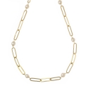 Łańcuch składa się z eleganckich, wydłużonych owalnych siatków, pomiędzy którymi znajdują się jasne perły, które dodają ponadczasowej klasy.