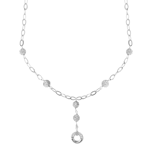 Wyrafinowany projekt wzbogaca się o cztery błyszczące kulki pokryte białym cyrkonem, idealnie zrównoważone wzdłuż łańcucha, tworząc punkty światła, które tańczą przy każdym ruchu. W środku, elegancki obłok złożony z dwóch kul cyrkonów, który prowadzi wzrok w kierunku wyrafinowanego, okrągłego elementu, który harmonijnie łączy błyszczącą powierzchnię białego złota z intensywnym blaskiem cyrkonów umieszczonych na pół obwodu.