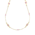 Ten wyjątkowy naszyjnik posiada delikatny łańcuch z 18-karatowego żółtego złota, ozdobiony czterema symbolicznymi oczkowymi kolczykami, delikatnie wykonanymi z różowym emalem i centralnym szczegółem kontrastu, co zastępuje się jasnymi różowymi szpinami, które przy każdym ruchu uchwycają światło.