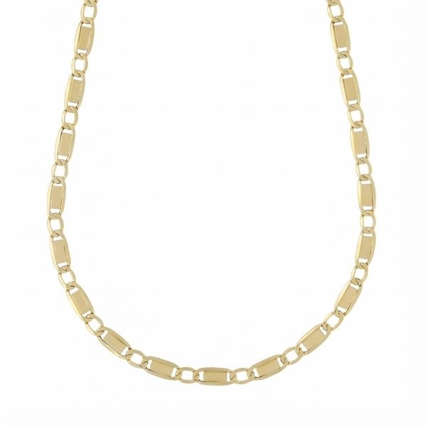 Ten naszyjnik wykonany w całości z 18-karatowego złota wyróżnia się charakterystycznym, płaskim ogniwem, ułożonym naprzemiennie. To proces, który pozwala uzyskać szeroką, błyszczącą powierzchnię, która odbija światło z wyjątkową intensywnością.