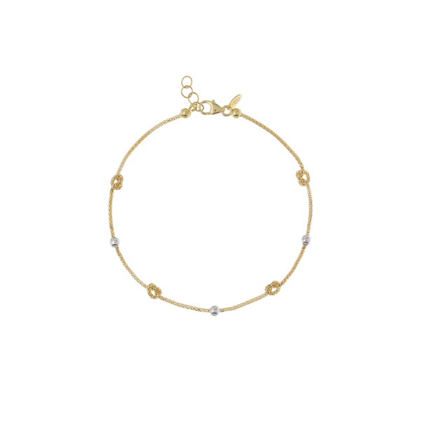 Delicadeza e sofisticação misturam-se nesta encantadora pulseira de ouro amarelo 18K, onde a elegância da tradição ourives encontra um design contemporâneo e minimalista. A cadeia fina em ouro amarelo é embelezada com nós refinados que alternam harmoniosamente com pequenas esferas em ouro branco, criando um jogo de contrastes brilhantes e sofisticados.