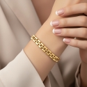 Composta por uma fileira dupla de elementos ovais e alongados, a pulseira apresenta uma superfície polida que lhe confere um brilho discreto e sofisticado.