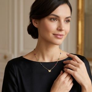 Lasă-te captivată de o bijuterie care surprinde toată magia primăverii. Acest rafinat choker din aur galben de 18 karate este mai mult decât un simplu accesoriu, ci o celebrare a ușurinței și a bucuriei de a trăi.
