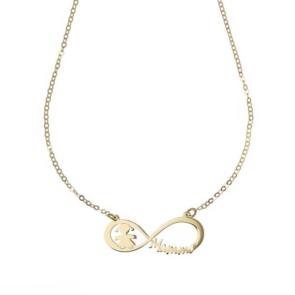 Ова огрлица није само додатак, већ је поклона безусловној љубави између мајке и ћерке. Симбол бесконачности хармонично спаја фигуру девојчице и натпис 'Мама', стварајући снажну и трошне визуелне поруке.