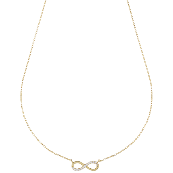 Låt dig överväldigas av detta raffinerade 18-karats gula guld, där värmen från den dyrbara metallen upphöjer symbolen för oändlighet i en omfamning av ljus och mening. Den delikata pendeln, som symboliserar evighet och oändliga möjligheter, är prydd med en halvsten av vita zirkoner som lyser vid varje rörelse, vilket skapar en fascinerande kontrast till guldets glans.