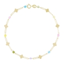 这款迷人的黄金手链定能点亮您的每一天。现代感十足的回形针式链条上,点缀着各种精美元素:闪闪发光的幸运四叶草和闪烁着光芒的彩色小珠子。